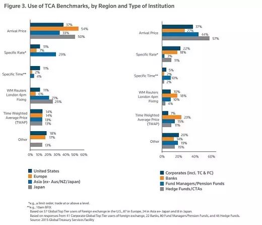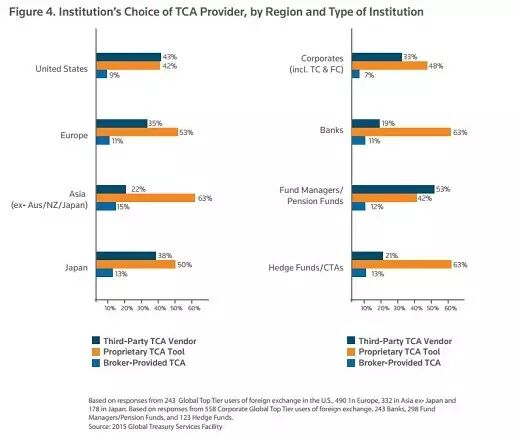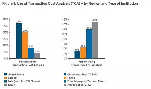 去年,全球外汇交易使用交易成本分析(TCA)的机构数量增长缓慢,大的机构TCA使用率仅从15%增长到了17%。大部分的机构仍然通过传统方式来保证得到最好的价格。然而,今年27%的美国和20%的欧洲外汇交易机构和42%的对冲基金都在使用交易成本分析(TCA).