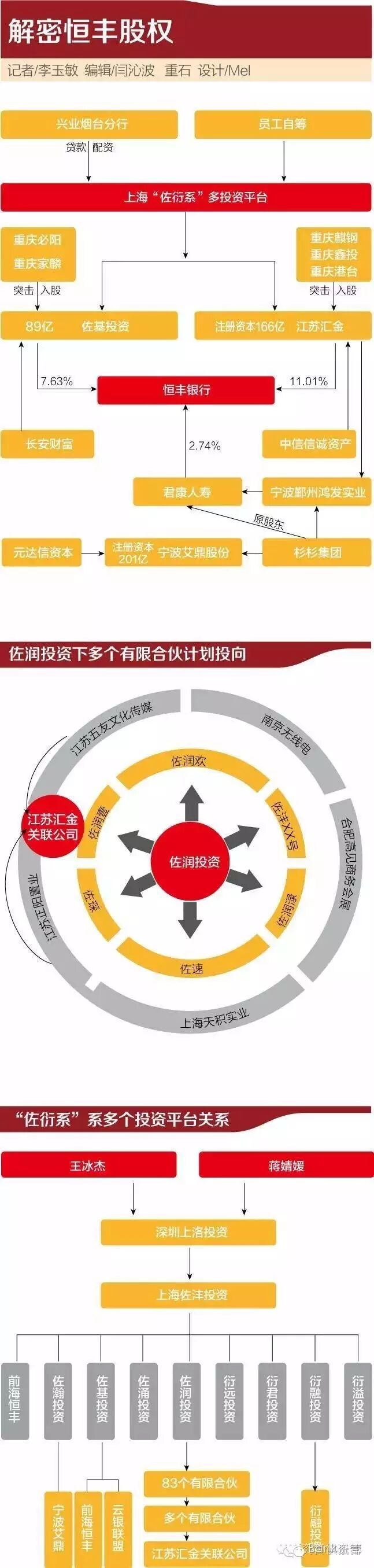转自微信公众号i资管俱乐部(ID:amcfeed)Bank资管整理规模快速扩张突破万亿后,恒丰银行推出了员工持股计划。但或许,这一步迈得有点大。恒丰银行曾承认员工持股计划未经监管部门批准,然后迅速退股,以致员工持股计划从筹资到搁浅仅仅一年。不过,21世纪经济报道记者通过多方调查显示,这一年中,员工持股计划起起落落,几番波折,不确定性陡然增加,很多参与者都难言其命运归宿。唯一可以肯定的是,伴随着这一计划的诞生,大量影子股东忽明忽暗。而在员工持股计划走向终结时刻,回头来看可以发现,往日被认为代表原董事长旧势力的“敌方”,甚至已经化敌为友。据21世纪经济报道记者调查,江苏汇金控股集团有限公司(以下简称“江苏汇金”)、上海佐基投资管理有限公司(以下简称“佐基投资”)和宁波艾鼎股权投资合伙企业(以下简称“艾鼎投资”)作为恒丰银行重要的持股平台,其背后的股权关系错综复杂,短短一年内注册资本从几亿元分别暴增近百倍至166亿元、89亿元和201亿元。而这几家平台的股东中,多家来自重庆的神秘公司突击入股,这些公司最终追溯到的几位自然人股东竟然来自同一村庄,有些股东的身份证地址甚至完全相同。此外,这些股东中还有中信信诚资产管理有限公司、长安财富资产管理有限公司、元达信资本管理(北京)有限公司等基金子公司的身影。接近恒丰银行的人士也向21世纪经济报道记者透露,“恒丰银行曾通过资管部某负责人转出280亿元,主要用于购买君康人寿的股权。”不过,该位负责人目前正因其它业务接受调查。记者亦无法从其它渠道获得更多信息。此前8月22日,君康人寿披露的关联交易信息显示,其与间接持有君康人寿19.2%股权的江苏汇金签署协议,受让江苏汇金持有的恒丰银行32621.77万股。以2015年年报披露总股本计算,君康人寿的这笔转让涉及股权占比2.74%。2015年6月,恒丰银行在未经监管部门批准的情况下推行了员工持股计划。此前媒体报道,恒丰银行本次用于实施员工股权激励计划而定向增发的股份不超过52亿股,股权激励对象为核心员工和价值员工,每股认购价格为3元。根据级别不同,认购数量从恒丰分行行长到员工共分出10个档次,最高一档的认购数量是100万-500万股,而最低一档是0-5万股。而总行高管层的认购额度在500万股以上,董事长蔡国华的认购额是2000万股。即便每股3元远远低于恒丰银行2014年每股净资产的4.47元,员工认购股权的资金并非全部自己出资,而是通过兴业银行烟台分行进行配资。根据员工层级的不同,自筹和融资部分的比例亦不相同,比例分别是1:9、2:8、3:7、4:6,级别越高,个人出资比例越低。恒丰银行原行长栾永泰近日在接受21世纪经济报道记者采访时也承认,他本人的认购额度为1800万股,共计需要资金5400万元,不过配资比例为1:9,他本人仅出资540万元,其余的4860万是从兴业银行烟台分行的贷款。栾永泰表示:“我退休以后恒丰才推出贷款买股(员工持股、贷款配资)计划。我个人出资540万,贷了将近五千万,具体他们怎么操作我不知道,我就只是在这些文件上签了字。我当时只是觉得利率为什么那么高?年化是6%。”恒丰银行官网于2016年7月21日挂出的2015年年报中表示,“2015年1月12日,公司董事会在上海召开。会议审议通过了《关于恒丰银行行员等级管理办法(试行)的议案》、《关于恒丰银行股份有限公司实施员工股权激励计划的议案》”。一名恒丰银行员工给21世纪经济报道出示的扣款信息显示,2015年6月员工出资部分已经完成了缴款。不过,2016年5月,媒体曝出恒丰银行违规进行员工持股等问题后。恒丰银行对外表示,“暂缓实施员工股权激励计划”。多位恒丰内部人士已证实,员工持股计划已搁浅,员工本人的出资部分已于2016年5月末全员退股。至于从兴业银行烟台分行的配资部分,怎么处理以及利息如何支付,员工并不知情。恒丰银行2015年年报显示,2015年度,该行累计收到股东投入的资金60.8亿元,其中18.45亿元计入股本,42.44亿元计入资本公积。截至2015年末,恒丰银行总股本为118.94亿股。恒丰银行年报中的现金流量表也显示,该行2015年吸收投资267.48亿元,而2014年这一数据仅为31.67亿元。其中2015年上半年收到的投资现金为103.05亿元,而2016年上半年这一数据则变为了-21亿元,业内人士猜测这部分减少或许是因为员工退股。财新杂志曾报道,恒丰银行员工持股通过兴业银行烟台分行配资购股共计100亿元,而这笔员工持股计划最后以268亿元入账,凭空多出168亿元;在违规员工持股被曝光后,这168亿元又离奇不见了。而接受21世纪经济报道记者采访的多位内部人士则称,恒丰银行员工持股款项仅有部分入账,具体的操作方式以及持股平台如果不是媒体报道出来,员工对此并不知情。至于,恒丰银行为何要仓促推进员工持股计划?有一种来自恒丰银行高层的说法是,现任董事长蔡国华当时“空降”恒丰后,银行经营局面并不乐观。此后该行力推转型改革,分支机构扩张加速,资产规模增长迅猛,但同时也带来资本充足率逼近监管红线的结果。另一位恒丰银行高层也对21世纪经济报道记者表示,在实施员工持股计划前,恒丰银行曾经想通过向股东配股来募集资金,但有的股东对配股意愿并不积极,甚至有股东提出要以恒丰银行贷款入股,遭拒。配股融资方案行不通后,恒丰银行开始考虑员工持股计划,同时希望以此吸引