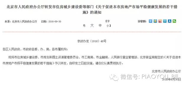 9月30日晚间,北京市政府网站挂出了北京市人民政府办公厅转发市住房城乡建设委等部门《关于促进本市房地产市场平稳健康发展的若干措施》的通知,措施自印发之日起执行。