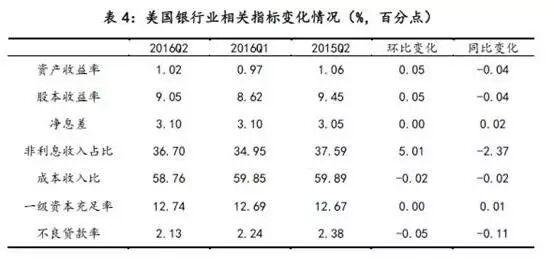盈利水平回升,经营效率有所改善。2016年二季度,美国银行业净利润为436亿美元,同比上升1.4%,环比上升11.5%;资产收益率为1.0%,同比下降0.1个百分点,环比上升0.1个百分点;股本收益率为9.1%,同比下降0.4个百分点,环比上升0.4个百分点;成本收入比为58.8%,同比下降1.13个百分点,环比下降1.1个百分点;非利息收入占比为36.7%,同比下降2.37个百分点,环比上升5.0个百分点(表4)。