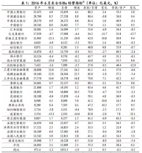 截至2016年6月末,30家G-SIBs的资产和负债规模分别为50.7万亿美元和47.1万亿美元,同比均上升2.1%,平均增速同比分别下降1.2个和1个百分点。与国际同业相比,中国G-SIBs的资产和负债增速较高,资产增速平均为7.1%,负债增速平均为6.6%。