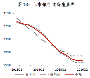 2016年上半年,上市银行拨备覆盖率为164.7%,较2015年同期下降25.1个百分点。其中,五大行拨备覆盖率为157.3%,较2015年同期下降29.1个百分点;股份制银行拨备覆盖率为178.2%,较2015年同期下降16.0个百分点(图13)。部分上市银行拨备覆盖率已经跌至150%的监管红线以下。