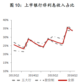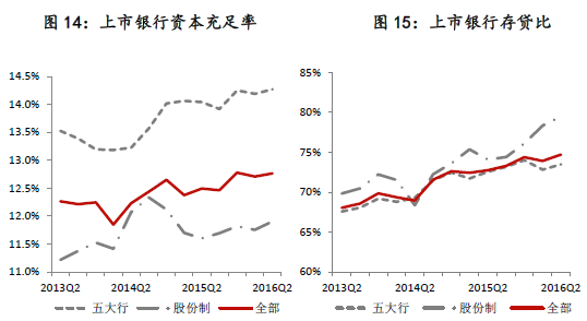 截至2016年6月末,上市银行存贷比为74.7%,同比上升2.0个百分点。其中,五大行存贷比为73.5%,同比上升0.9个百分点;股份制银行存贷比为79.5%,同比上升5.4个百分点(图15)。