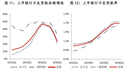 截至2016年6月末,上市银行不良贷款余额为1.1万亿元,同比增长28.5%,增速较2015年同期下降23.7个百分点;不良贷款率为1.68%,同比上升0.2个百分点。其中,五大行不良贷款余额为8079.5亿元,同比增长25.7%,增速较2015年同期下降26.0个百分点;不良贷款率为1.72%,同比上升0.2个百分点。股份制银行不良贷款余额为2688.8亿元,同比增长37.2%,增速较2015年同期下降17.0个百分点;不良贷款率为1.61%,同比上升0.3个百分点(图11、图12)。