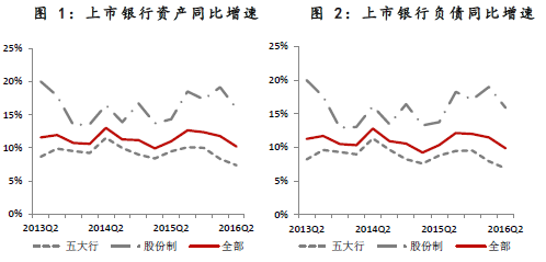 截至2016年6月末,上市银行资产、负债总额分别为127.6万亿元和118.5万亿元,同比增长10.2%和9.9%,增速较2015年同期分别下降0.8和0.5个百分点。其中,五大行资产、负债总额分别为87.5万亿元和80.9万亿元,同比增长7.4%和6.9%,增速较2015年同期分别下降2.1和1.9个百分点;股份制银行资产、负债总额分别为36.3万亿元和34.0万亿元,同比增长15.9%和15.9%,增速较2015年同期分别上升1.6和2.2个百分点(图1、图2)。
