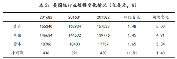资产、负债规模继续增长。截至2016年二季度末,美国银行业③资产规模为16.5万亿美元,同比增长5.0%,环比提高1.5%;负债规模为14.7万亿美元,同比增长4.9%,环比提高1.5%;总资本规模为1.9万亿美元,同比增长5.3%,环比提高1.7%(表3)。