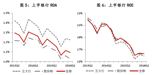 2016年上半年,上市银行总资产净利率(ROA)和净资产收益率(ROE)分别为1.09%、16.29%,同比分别下降0.1个和2.1个百分点。其中,五大行ROA和ROE分别为1.23%、15.93%,同比下降0.1个和2.1个百分点;股份制银行ROA和ROE分别为1.03%、16.16%,同比下降0.1和2.1个百分点(图5、图6)。