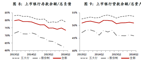 截至2016年6月末,上市银行存款余额占总负债和贷款余额占总资产的比重分别为73.5%、51.0%,同比分别下降1.4和上升0.3个百分点。其中,五大行两项指标分别为78.9%、53.6%,同比分别上升0.4和0.7个百分点;股份制银行两项指标分别为61.7%、45.9%,同比分别下降4.7和0.1个百分点(图8、图9)。