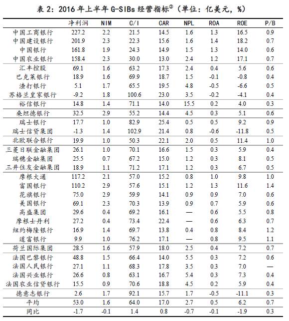 2016年上半年,30家G-SIBs平均净息差为1.6%,同比下降0.1个百分点。中国G-SIBs的净息差为2.2%,同比下降0.3个百分点。