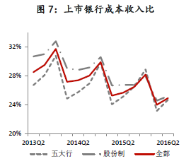 2016年上半年,上市银行成本收入比为24.92%,同比下降0.8个百分点。其中,五大行成本收入比为24.70%,同比下降0.4个百分点;股份制银行成本收入比为25.19%,同比下降1.6个百分点(图7)。