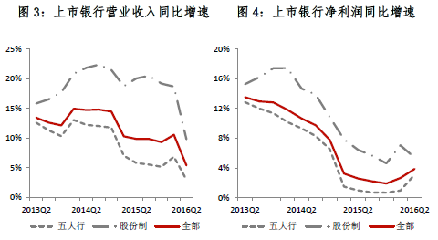 2016年上半年,上市银行实现营业收入1.9万亿元、净利润7360.7亿元,同比分别增长5.4%和3.9%,增速较2015年同期分别下降4.5和上升1.3个百分点。其中,五大行分别实现营业收入1.3万亿元、净利润5348.4亿元,同比增长3.0%和3.1%,增速较2015年同期分别下降2.8和上升2.1个百分点;股份制银行分别实现营业收入5650.6亿元、净利润1820.0亿元,同比增长9.8%和5.4%,增速较2015年同期分别下降10.2和1.1个百分点(图3、图4)。
