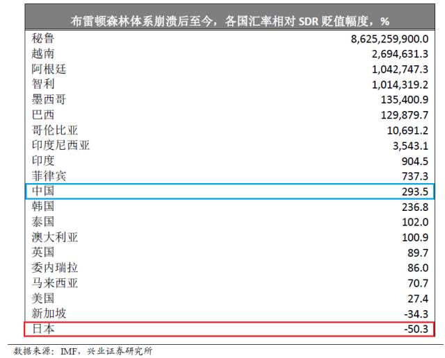 人民币刚刚在10月1日纳入了“特别提款权”(SDR)一篮子货币。而一项研究恰恰表明,自“特别提款权”诞生以来的40多年里,主要货币只有日元对SDR升值了大约50%,其他各国货币(新加坡除外)都对SDR大幅贬值,包括美元、英镑和人民币(见下图)。