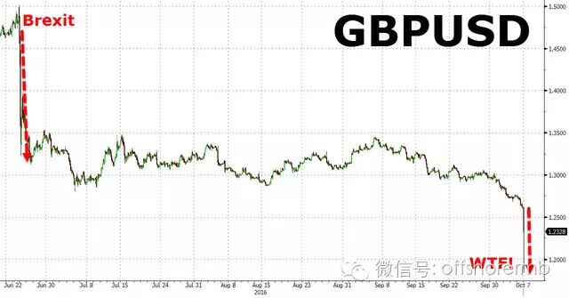 在亚洲早盘,英镑意外闪崩,一度在几分钟内暴跌逾10%,创下英国脱欧公投以来的最大盘中跌幅。