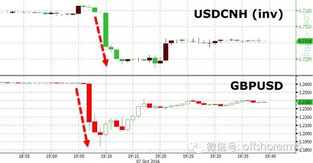 英镑的闪崩也影响到了亚洲时段其他市场的表现,标普500期货微跌0.2%,大部分亚洲股市走低。值得注意的是,在英镑闪跌的同时,离岸人民币市场也被牵连。