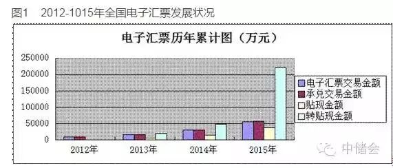 根据人民银行数据统计,从2012年至2015年全国电子商业汇票交易笔数累计平均每年增长113%,交易金额平均每年增长165.6%,承兑笔数平均每年增长113%,承兑金额平均每年增长167%。其中贴现金额与转贴现金额在2014年以后迅猛增长,2015年两者金额分别较上年增长148.3%和360%。