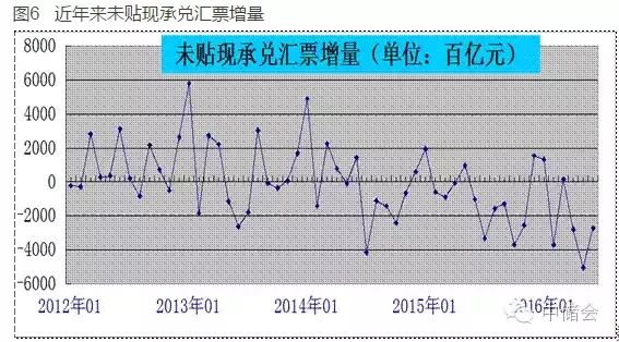 近几年来,承兑汇票贴现力度加大,未贴现承兑汇票金额增量重心下移。从图6中可以看出,2014年全年未贴现承兑汇票余额减少1286亿元,2015年未贴现承兑汇票余额减少达10566亿元,而在2016年仅前7个月就减少了12770亿元。