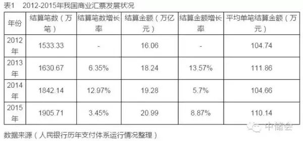 通过央行历年支付体系运行报告我们可以看出,我国商业汇票无论从结算笔数还是结算金额,平均每年的结算量都有较快增长。从2012年到2015年累计每年商业汇票笔数年均增长8%,结算金额年均增长10%,但是年度间起伏波动较大。单笔结算金额的变动反映出企业对商业汇票融资需求的变化,从结算量和结算金额双增,而单笔结算金额发生波动来看,说明我国实体经济整体景气度也在出现波动。具体如表1所示。