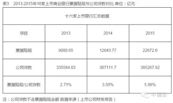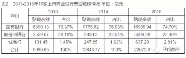 从16家上市商业银行公开数据看,承兑汇票贴现余额近年来大幅上升,且国有商业银行票据贴现余额增长较快,2014年16家上市商业银行票据贴现当年增幅达41.44%,2015年当年增幅更高达76.53%。票据贴现占公司贷款的比重由2013年末的2.71%上升到2015年末的5.88%,增长了3.17个百分点,有力支持了表内信贷规模增长。具体见表2和表3。