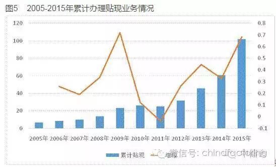 从2014年1月至2016年7月,全国金融机构票据融资规模增长34785亿,余额达到53573亿,创历史最高水平,增幅达185%,占当年新增贷款比例为15%,这是近几年来少有的。在经济新常态下,国外特别是欧洲需求疲弱导致我国出口下滑,实体经济不景气,中小企业转型发展和创新不足。抑制房地产过度投资,以及“三降一去一补”等顺应供给侧改革措施的落地,国内商业银行信贷资产质量面临严峻考验,不良率大幅攀升。在商业银行表内信贷资产增长不足的双向夹击下,银行加大了票据贴现的力度,将票据资产向表内信贷转移。2005-2015年各家商业银行累计办理贴现业务量总体呈现增长态势,年均累计办理贴现业务增幅达到33.05%,见图5。