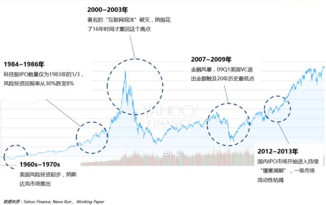 我们以高科技风向标的美国纳斯达克市场的变化趋势来体会这种变化。二十世纪六七十年代纳斯达克市场推出,到1984~1986第一次科技泡沫破裂,第一次寒冬来临,美国风险投资年回报从30%跌至8%;第二次寒冬发生在2000年,2000年前纳斯达克达到泡沫巅峰,纳斯达克指数飚至5000点,市场平均P/E达到150倍,看来一点不比A股差。2000年开始著名的互联网泡沫破裂,纳指2年跌掉75%,纳斯达克花了16年才重新回到高点;2008年发生第三次次金融风暴,美国VC退出金额触及20年来的最低点;2012年第四次资本寒冬到来,一级市场流动性枯竭;然后就是2015年下半年开始的这一轮调整,一大批所谓的独角兽企业因业绩不达预期而纷纷倒下,或者正在倒下。