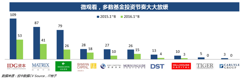 我们尝试着从第三方数据库抽了几家一贯相对活跃的VC和PE,看看他们同比投资数量的变化。我们同样看到大幅下滑的数据趋势,这些基金投资数量同比基本都下降了2/3以上,比较极端的情况是老虎基金到8月份甚至还没有出手。
