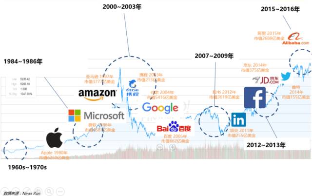 我们看到,在第一次资本寒冬后微软和亚马逊上市,目前市值分别达到4600亿美元和3800亿美元左右;第二次资本寒冬后谷歌和百度上市,市值分别达到5400亿美元和660亿美元左右;第三次资本寒冬后Facebook上市,目前市值达到3600亿美元左右;第四次寒冬后京东和阿里上市,市值分别达到370亿和2700亿美元左右。