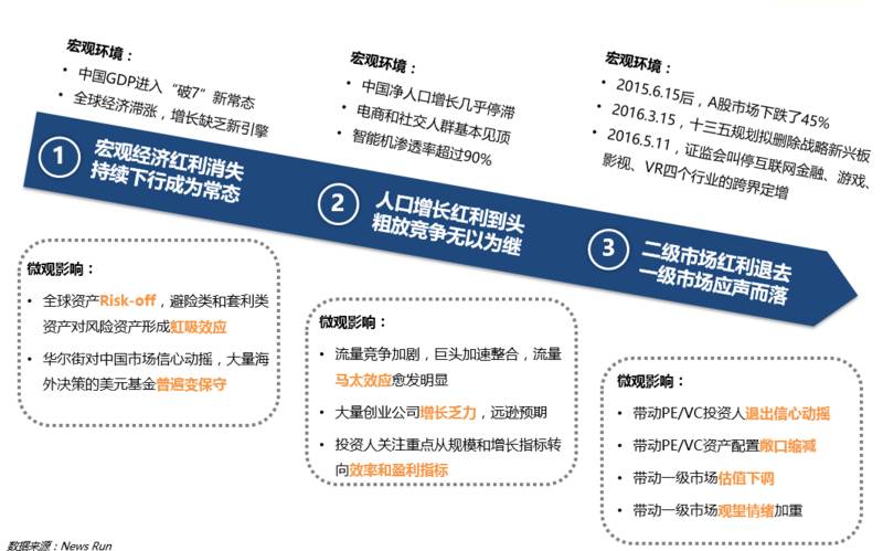我们尝试着从自己的视角来解读下寒冬发生的原因,市面上有很多专家解读,我们谈谈自己感知最深切的部分。事实上,我们认为这次资本寒冬早就该了,虽然听起来不太舒服,但这就是事实。我们认为,三个方面的红利消失推动着市场快速下行,分别是经济增长红利消失、人口增长红利消失、二级市场成长红利消失。