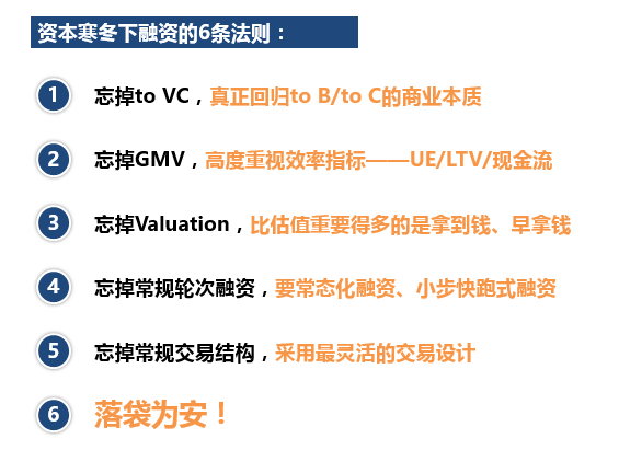 “缓称王”是战略心态,是“道”层面的事情,今天不重点讲。“高筑墙”和“广积粮”是兼具“道”和“术”层面的话题,今天结合融资策略我重点来分享些我们的看法。总结下来我们取个名字,就叫资本寒冬下的6条融资法则吧。