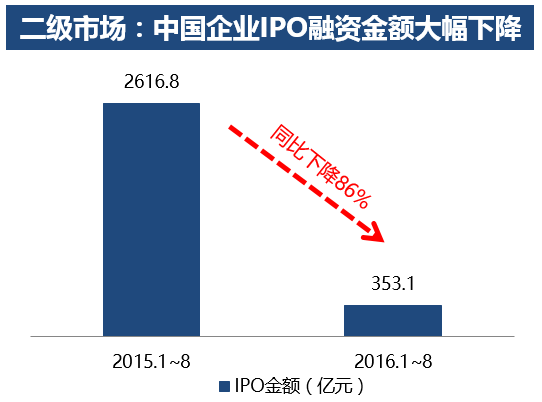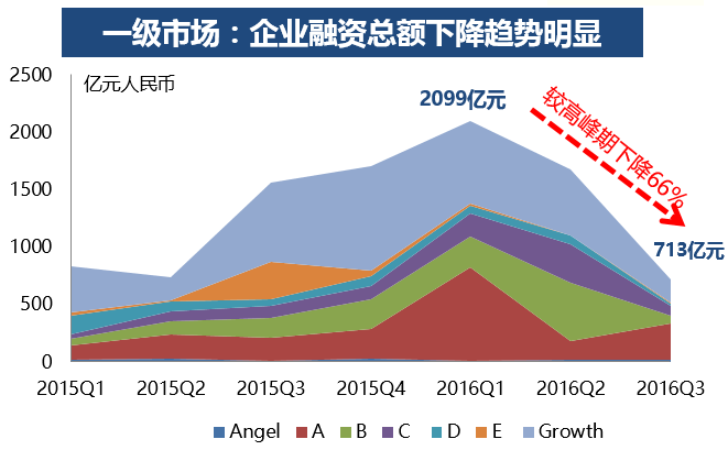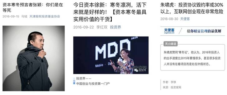 当然,回到今天的主题,我们必须承认,资本寒冬真的来了。我们来看一组公开的市场数据:先看反馈调整最及时的二级市场。我们观察到2016年1~8月中国企业海内外IPO融资总额同比下降了86%;而一级市场看2016Q3融资总额也比高峰期下降了66%。考虑到一级市场的传导效应,以及融资披露时间滞后等因素,我们认为实际的情况比这个数据看起来会更糟糕。