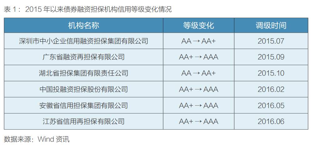 在中央政府对融资担保行业的扶持政策引导下,多家大型国有担保机构大幅增资。2015年以来,江苏省信用再担保有限公司注册资本从37.34亿元增至52.49亿元;广东省融资再担保有限公司注册资本从28.1亿元增至60.1亿元;安徽省信用担保集团有限公司注册资本从69.66亿元增至127.66亿元。在增资推动下,信用评级机构对债券市场担保行业信心增强,信用等级稳中有升。2015年以来,各评级机构共上调6家债券市场担保机构的信用等级,无下调等级,被上调级别的担保机构主要为主体级别在AA及以上的地方国有担保机构(见表1)。