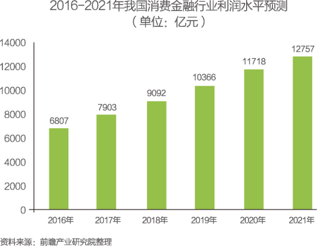 2014年,首批4家试点消费金融公司均实现盈利,行业盈利能力大大提升。随着消费金融公司试点的逐步开放,市场竞争加剧,行业总体利润率将有所下降,预计到2021年,行业整体利润规模将超过1.2万亿元。