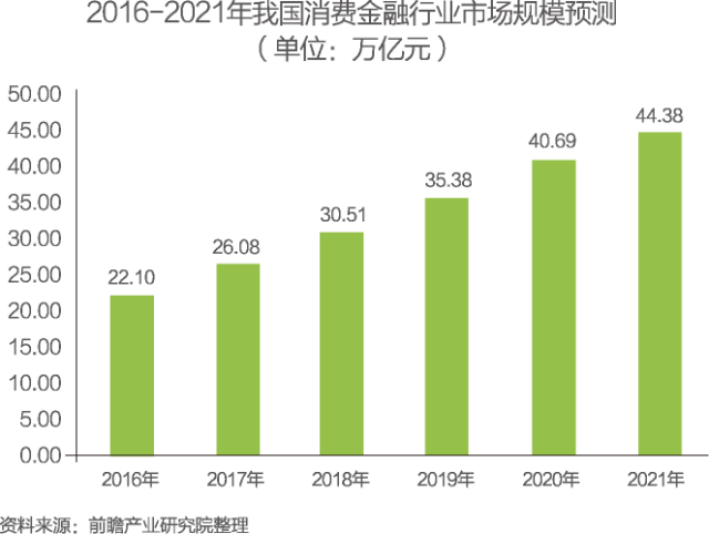 近年来,伴随着我国经济转型对刺激消费、扩大内需进而调整经济发展结构的迫切需求,以及居民收入和消费能力的提升,我国消费金融市场取得了快速的发展。前瞻产业研究院预计,2016-2021年中国消费信贷规模依然将维持15%以上的增长率,预计2021年将达到44.38万亿。