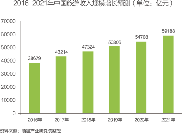 根据2007-2015年国内旅游收入增速预测,2016-2021年中国旅游收入规模增速在7.3%-13.72%之间,预测2021年国内旅游规模超过59000亿元以上。
