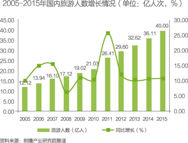 2015年,国内旅游人数达到40亿人次,成为全球最大的国内旅游市场。入境旅游约1.33亿人次,出境旅游约1.2亿人次。旅游直接就业2798万人,旅游直接和间接就业7911万人,占全国就业总人口的10.2%。