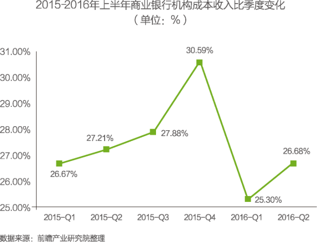 从季度来看,2015年,商业银行成本收入比呈上升趋势。2014年第四季度,商业银行机构成本收入比为30.59%。截止至2016年第二季度,商业银行机构成本收入比为26.68%。