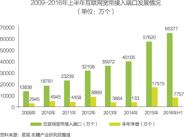 2015年,互联网宽带接入端口数量突破5亿个,比上年净增17515万个,2016年上半年,互联网宽带接入端口数量突破6亿个,比上年净增7757万个。