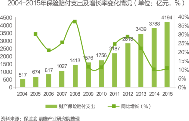 从2004年到2015年,我国财产保险赔付支出从517亿元增长到4194亿元,年均复合增长率达到了20.96%。