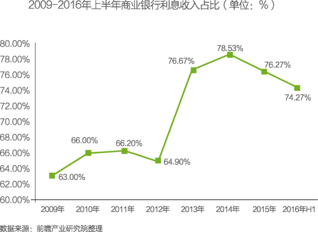 2009年以来,商业银行利息收入占比在63%以上,2015年利息收入占比有所下滑,为76.27%。2016年上半年,商业银行利息收入占比为74.27%。