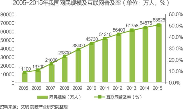 截至2015年12月,我国网民规模达6.88亿,全年共计新增网民3951万人。互联网普及率为50.3%,较2014年底提升了2.4个百分点。