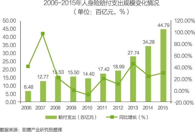 人身险赔付规模呈现波动趋势,2014年较上年增长至44.79百亿元,同比增长30.66%。