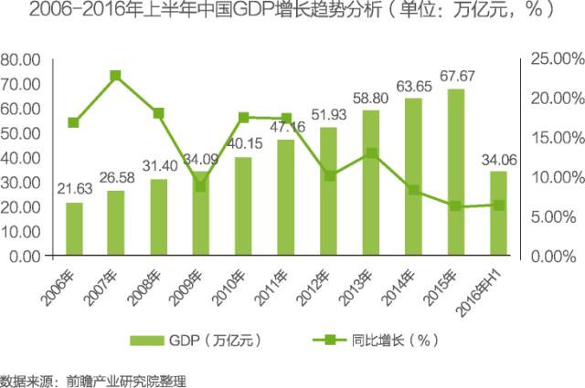 2016年上半年,国内生产总值340637亿元,按可比价格计算,同比增长6.7%。分季度看,一季度同比增长6.7%,二季度增长6.7%。分产业看,第一产业增加值22097亿元,同比增长3.1%;第二产业增加值134250亿元,增长6.1%;第三产业增加值184290亿元,增长7.5%。从环比看,二季度国内生产总值增长1.8%。