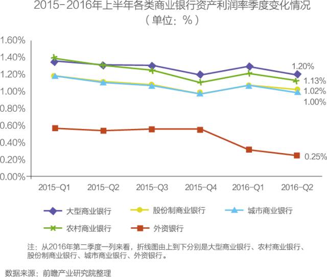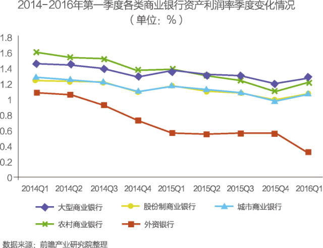 从各类商业银行资产利润率季度变化情况来看,大型商业银行资产利润率最高,其次是农业商业银行、股份商业银行和城市制商业银行,外资银行资产利润率最低。