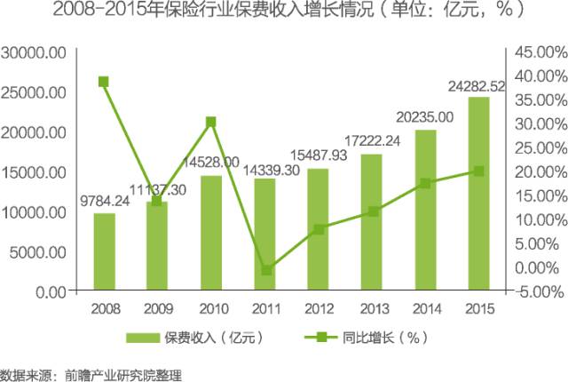 2015年全国保费收入2.4万亿元,同比增长20%。其中,财产险保费收入7995亿元,同比增长11%;人身险保费收入1.6万亿元,同比增长25%。为全社会提供风险保障1718万亿元,赔款与给付8674.1亿元,同比增长20.2%。