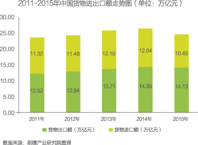 2015全年货物进出口总额245741亿元,比上年下降7.0%。其中,出口141255亿元,下降1.8%;进口104485亿元,下降13.2%。货物进出口差额(出口减进口)36770亿元,比上年增加13244亿元。