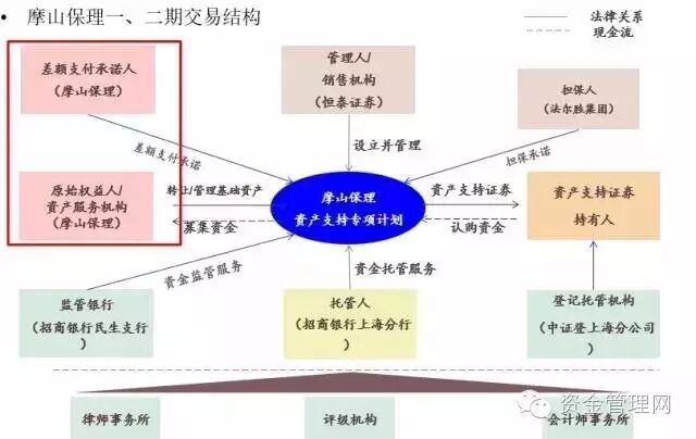 以摩山保理一、二期交易结构为例(如图),管理人即销售机构恒泰证券设立并管理摩山保理资产支持专项计划,该专项计划由原始权益人即资产服务机构摩山保理负责转让、管理基础资产。摩山保理同时也是差额支付承诺人,担保人(法尔胜集团)进行担保承诺。招商银行民生支行作为监管银行提供资金监管服务,招商银行上海分行作为资金托管人提供资金托管服务。产品推出后,在中证登上海分公司登记的资产支持证券持有人认购资金。在整个交易结构搭建过程中,律师事务所、会计师事务所和评级机构深度参与并提供相关决策参考。