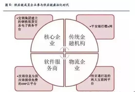 进入到互联网时代,供应链金融有了新的进展。这一阶段主要的变为可以总结为线下业务虚拟化,转移到线上。供应链成员利用互联网工具和IT 技术,对供应链中的物流、信息流、资金流进行虚拟化。这个过程并不是由一个核心企业带领的,而是供应链各个成员自发行为。这一阶段,供应链利益链条与1.0 时代并没有本质上的区别,然而物流、信息流与资金流的虚拟化带来了信息整合与分配却提高了供应链各方的效率。同时,通过这种整合与归集,能够衍生出为特定用户的融资、结算和理财等综合服务需求。在这一阶段,供应链成员企业都有各自的尝试。例如平安银行推出了“橙e 网”服务,提供免费的电商服务平台—“生意管家”,帮助企业轻松管理“1+N”链条客户群的进销存、订单-运单-收单,加速中型企业快速、零成本实现生意电商化。核心企业如宝钢,2014 年与上海市宝山区的政府投融资平台公司合作建立的钢铁现货交易电子商务平台。平台将钢材的现货交易搬到线上,同时以钢贸供应链为基础提供金融服务。一些中介服务商如原来以企业ERP 系统为主业的汉得信息转型为核心客户提供供应链金融操作平台。依托原有核心客户,并为这些核心客户的产业链上游中小供应商提供免费的ERP 云平台,在中小企业贷款的时候为银行提供数据验证等服务从银行贷款利息分成实现盈利。物流提供商如怡亚通,通过打造两大互联网平台——B2B“宇商网”和B2C“和乐网”,将渠道虚拟化,并通过“380”深度分销平台进行信息的整合与资源配臵。
