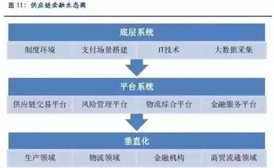 我们总结供应链金融生态结构为底层系统+平台系统+垂直应用。底层系统指的是制度环境、支付场景搭建、IT 技术以及大数据采集等基础环境。底层系统是供应链金融生态圈的基石。供应链金融生态圈的构建必须处在法律与金融监管合规的前提下,同时,供应链金融的场景搭建也需要时间普及。目前市场上有一些企业将供应链业务搬上网然后就开始做供应链融资服务,却忽略了供应链中真实的支付、结算等需求才是供应链金融最真实和普及的场景。只有在这种场景构建下,不断培养中小型企业的线上交易习惯才能真实的收集到底层数据,采集到丰富的个体信用习惯,才能利用IT 技术与大数据搭建征信与风控系统。