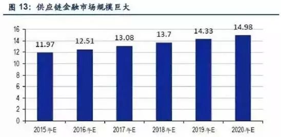 根据前瞻产业研究院的研究,全国企业的应收账款规模在26 万亿以上。假如用这些应收账款当作银行贷款的潜在抵押品加以充分利用,可以预见未来我国供应链金融发展市场潜力巨大,到2020 年,我国供应链金融的市场规模可达14.98 万亿元左右。根据统计,目前国内供应链金融市场规模刚突破8 万亿,这说明未来可以挖掘的空间仍然很大。我们判断,在利差收入下降后,中间收入将成为银行的新的利润增长点,实体经济也将通过切入金融产业,提供利润率,由此双方都有动力促进供应链金融业务的发展。