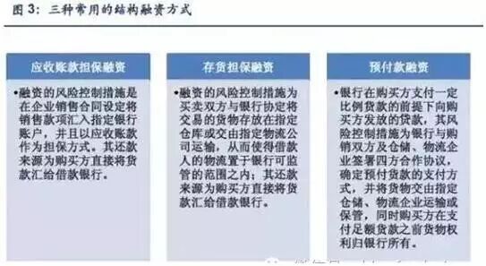 为了解决供应链条上的资金缺口,结构性融资营运而生。作为一种金融创新,结构性融资在美国金融市场融资总量中已经占比达到30%。结构性融资的核心在于使企业将拥有未来现金流的特定资产剥离开来,并以该特定资产为标的进行融资。也可以理解为,以现金资产将企业特定资产从其资产负债表中替换(资产臵换),在资产负债率不变的情况下,增加高效资产,之所以被称为“结构融资”,主要是因为从财务报表的结构考虑资产的臵换。结构融资创造性地运用各种传统的和创新的融资方式。目前比较常用的结构性融资方案有三种:应收账款担保融资、存货担保融资、预付款融资。