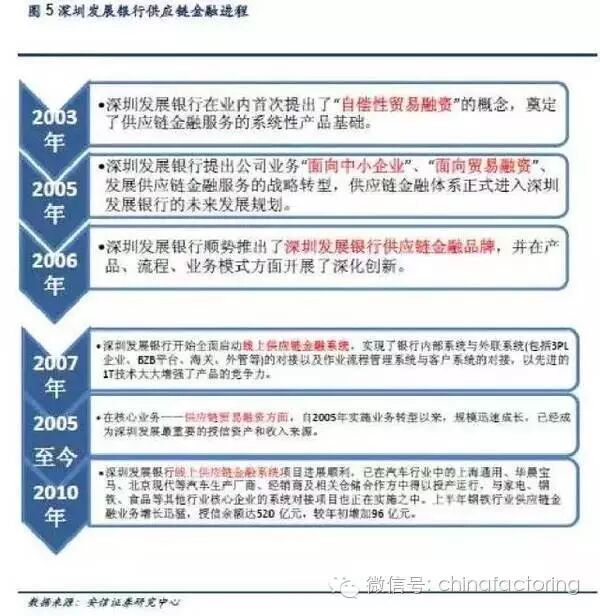 国内金融企业最早最成功的尝试是深圳发展银行。深圳发展银行经过10 多年的探索和实践,已经建立起了完整的供应链运营体系,开辟了全新的公司业务增长领域。在核心业务一一供应链贸易融资方面规模迅速成长,已经成为该行最重要的授信资产和收入来源。